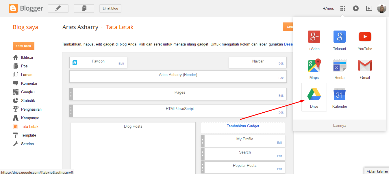 Sebenarnya cara masuk ke Google Drive tidak harus seperti itu, selain bisa kita akses langsung melalui url resminya, kita juga bisa masuk melalui tab disebelah kanan atas akun google saat kita berada di salah satu layanan google lainnya. Perhatikan gambar dibawah ini.