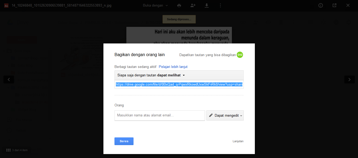 4. Setelah kita sudah membuat atau mengunggah file, kita bisa menshare ke orang lain dengan mengambil link sharenya, jadi orang lain bisa mendownload file yang kita bagikan diblog/situs web kita. Saya screenshoot seperti dibawah ini.